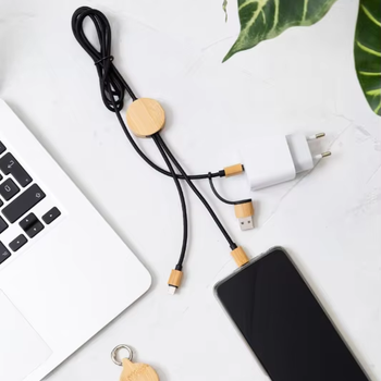 Cable de carga USB con mosquetón galvanizado de acero inoxidable y soporte móvil de Bambú